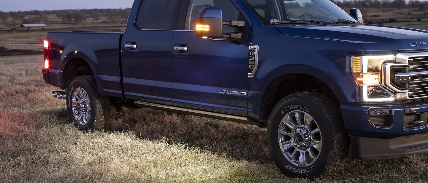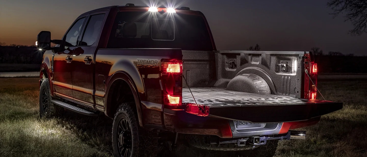 The 2022 Ford Super Duty® offers available LED lighting in the pickup box. And LED side-mirror spotlights, a center high-mounted stop lamp camera and security approach lamps are handy features included with the available PowerScope® trailer tow mirrors. So you can keep on working after the sun has set.