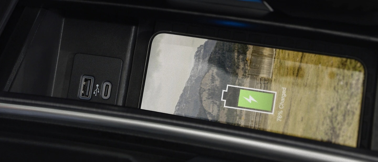 The available wireless charging pad accepts a wide range of devices with built-in charging capability. Simply set your phone with charging side down on the pad, located in the center console, while the vehicle is either running or in accessory mode. When your phone is fully charged, the unit will maintain it even while you're streaming music or making a call through the available SYNC® system.
