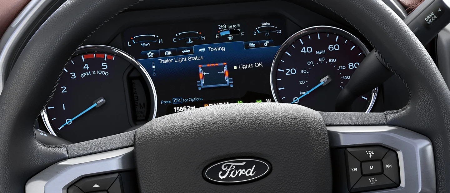 The available 8-inch LCD productivity screen puts valuable information on a wide variety of vehicle functions in front of you, with up to seven screens readily available through My View. Among them is a screen displaying towing functions, such as trailer brake controller and transmission tow/haul settings, vehicle pitch and steering angle, and profiles of up to 10 trailers. Choose the type of trailer connected (conventional, fifth-wheel or gooseneck) and go through a connection checklist that includes such items as mirrors adjusted properly, electrical wiring connected, lights functioning correctly, and others.