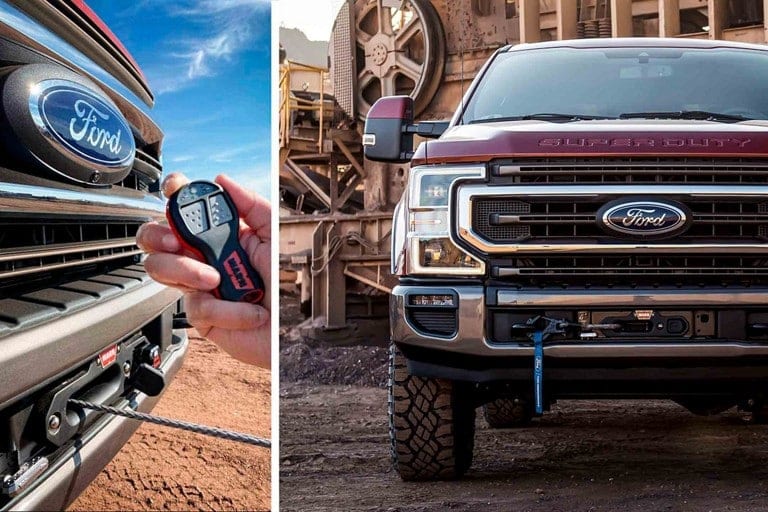Super Duty® models offer an available integrated electric winch with a 70-foot high-tensile strength, abrasion-resistant synthetic line and 12,000 pounds of winching power. The integrated electric winch is mounted behind the front steel bumper to provide optimized airflow and clearance, and includes the only wireless remote control in its class,* as well as a provision for a wired remote control. This winch can be bought new with your vehicle or installed by a Ford Dealer. **