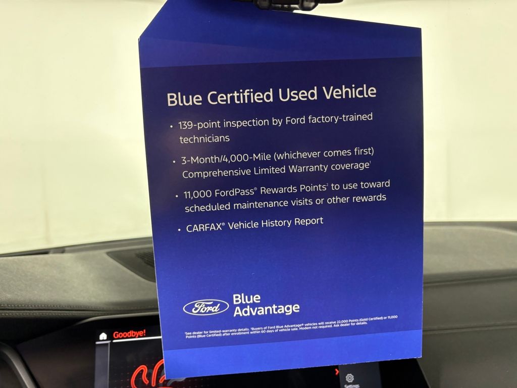 Ford Blue Certified includes:139 point vehicle inspection performed by an ASE Certified technician 3-month/4,000-mile Comprehensive Limited Warranty coverage that is fully competitive with other online retailers Blue Certification includes 11,000 FordPass Rewards Points For other manufacturers not listed above, Comprehensive Coverage is provided for 3 months or 4,000 miles, whichever comes first, from the signature date of the Ford Blue Advantage â" Blue Certified purchase. Comprehensive Limited Warranty covering 1,000+ components Travel expense reimbursement Rental car reimbursement SiriusXM 3 month trial.