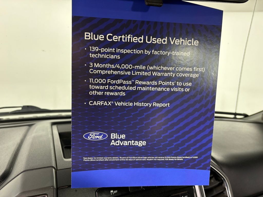 Ford Blue Certified includes:139 point vehicle inspection performed by an ASE Certified technician 3-month/4,000-mile Comprehensive Limited Warranty coverage that is fully competitive with other online retailers Blue Certification includes 11,000 FordPass Rewards Points For other manufacturers not listed above, Comprehensive Coverage is provided for 3 months or 4,000 miles, whichever comes first, from the signature date of the Ford Blue Advantage â" Blue Certified purchase. Comprehensive Limited Warranty covering 1,000+ components Travel expense reimbursement Rental car reimbursement SiriusXM 3 mont