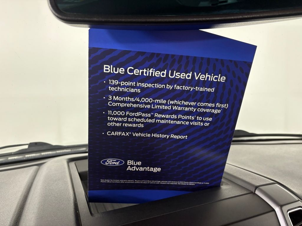139 point vehicle inspection performed by an ASE Certified technician 3-month/4,000-mile Comprehensive Limited Warranty coverage that is fully competitive with other online retailers Blue Certification includes 11,000 FordPass Rewards Points For other manufacturers not listed above, Comprehensive Coverage is provided for 3 months or 4,000 miles, whichever comes first, from the signature date of the Ford Blue Advantage â" Blue Certified purchase. Comprehensive Limited Warranty covering 1,000+ components Travel expense reimbursement Rental car reimbursement SiriusXM 3 month tria. Recent Arrival! Odometer is 15136 miles below market average!