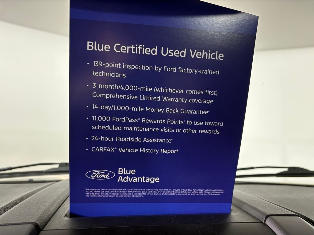 Ford Blue Certified includes:139 point vehicle inspection performed by an ASE Certified technician 3-month/4,000-mile Comprehensive Limited Warranty coverage that is fully competitive with other online retailers Blue Certification includes 11,000 FordPass Rewards Points For other manufacturers not listed above, Comprehensive Coverage is provided for 3 months or 4,000 miles, whic