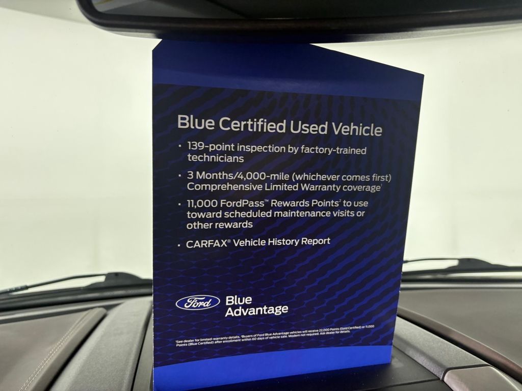 Ford Blue Certified includes:139 point vehicle inspection performed by an ASE Certified technician 3-month/4,000-mile Comprehensive Limited Warranty coverage that is fully competitive with other online retailers Blue Certification includes 11,000 FordPass Rewards Points For other manufacturers not listed above, Comprehensive Coverage is provided for 3 months or 4,000 miles, whichever comes first, from the signature date of the Ford Blue Advantage â" Blue