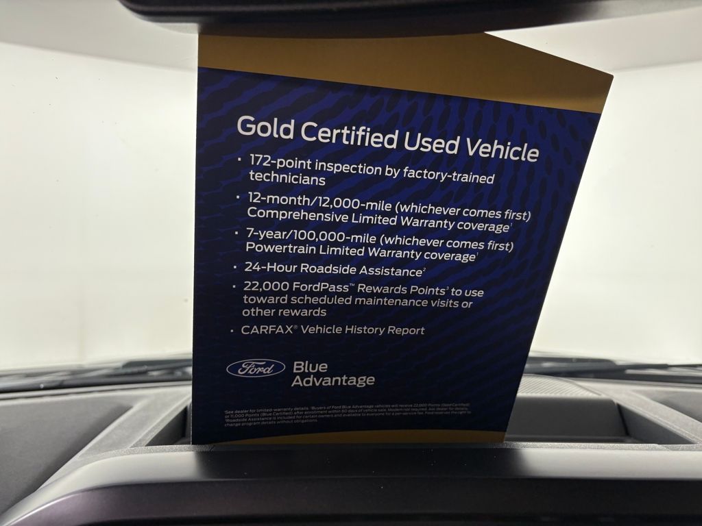 Ford Gold Certified includes:172 point vehicle inspection performed by a Ford Certified technician. 12-month/12,000-mile Comprehensive Limited Warranty coverage 7-year/100,000-mile Powertrain Limited Warranty coverage Gold Certification includes 22,000 FordPass Rewards Points Comprehensive Coverage: 12 months or 12,000 miles, whichever comes first, from the expiration of the new-vehicle bumperto-bumper limited warranty coverage or the date of sale as a certified vehicle, whichever is later. Comprehensive Limited Warranty covering 1,000+ components. Powertrain Coverage: 7 years from original new-vehicle warranty start date or 100,000 miles, whichever o