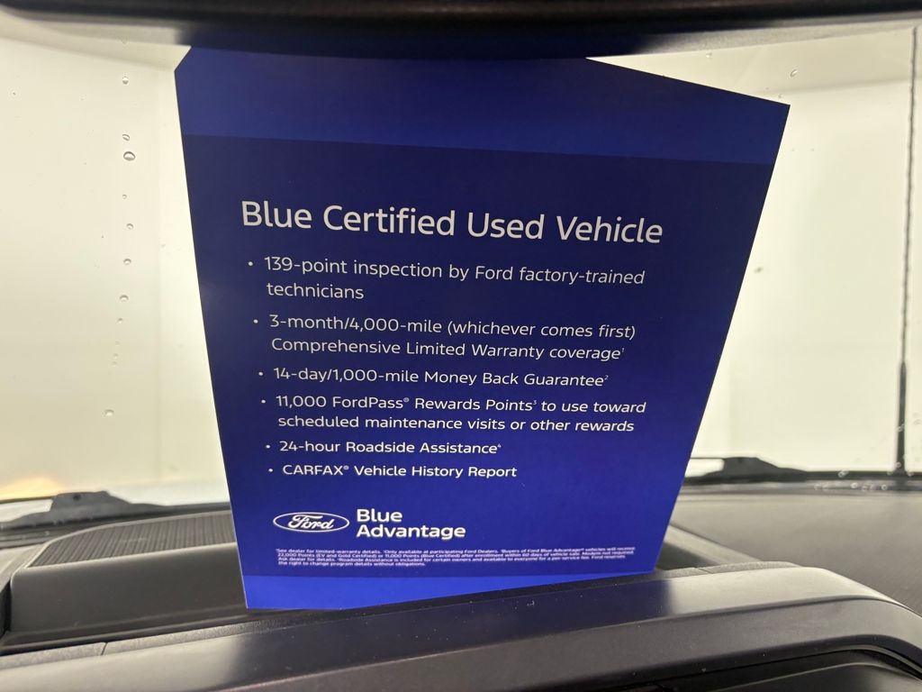 139 point vehicle inspection performed by an ASE Certified technician 3-month/4,000-mile Comprehensive Limited Warranty coverage that is fully competitive with other online retailers Blue Certification includes 11,000 FordPass Rewards Points For other manufacturers not listed above, Comprehensive Coverage is provided for 3 months or 4,000 miles, whichever comes first, from the signature date of the Ford Blue Advantage â" Blue Certified purchase. Comprehensive Limited Warranty covering 1,000+ components Travel expense reimbursement Rental car reimbursement SiriusXM 3 month tria. Recent Arrival!