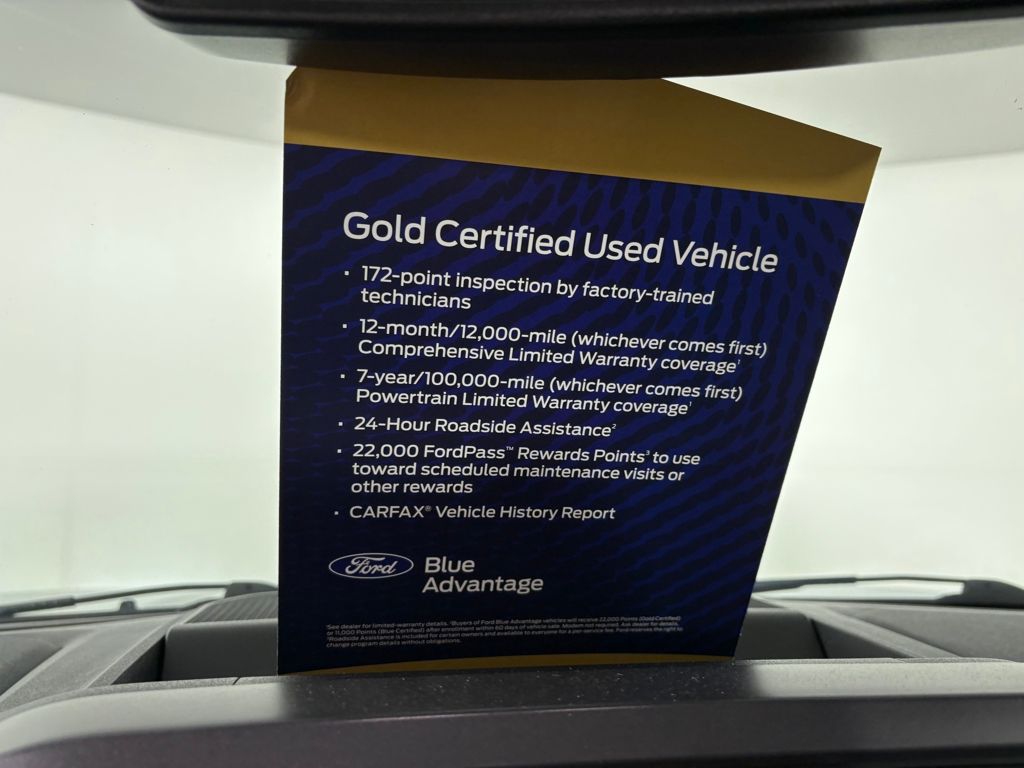 172 point vehicle inspection performed by a Ford Certified technician. 12-month/12,000-mile Comprehensive Limited Warranty coverage 7-year/100,000-mile Powertrain Limited Warranty coverage Gold Certification includes 22,000 FordPass Rewards Points Comprehensive Coverage: 12 months or 12,000 miles, whichever comes first, from the expiration of the new-vehicle bumperto-bumper limited warranty coverage or the date of sale as a certified vehicle, whichever is later. Comprehensive Limited Warranty covering 1,000+ components. Powertrain Coverage: 7 years from original new-vehicle warranty start date or 100,000 miles, whichever occurs first. Powertrain Limited Warranty covering select major components. 24/7 Roadside Assistance Travel expense reimbursement Rental car reimbursement SiriusXM 3 month trial Local home delivery Test-Drive at home. Recent Arrival! Odometer is 1292 miles below market average!