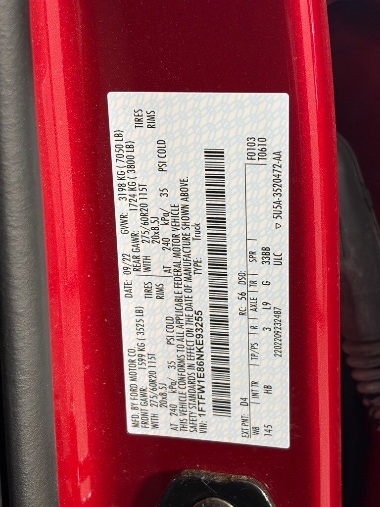 LARIAT SPORT APPEARANCE PACKAGE unique interior finish, Box Side Decals, Chrome Single-Tip Exhaust, Wheels: 18 6-Spoke Machined Aluminum, gloss black painted pockets, Accent-Color Angular Step Bars, Dark 2-Bar & 1 Minor Bar Style Grille, black surround and black mesh, Body-Color Front & Rear Bumpers, EQUIPMENT GROUP 501A MID Radio: B&O Sound System by Bang & Olufsen, HD radio and 8 speakers including subwoofer, Universal Garage Door Opener, Onboard 400W Outlet, Replaces two (2) front USB charge only ports and an additional outlet in the bed, ENGINE: 3.5L V6 ECOBOOST GVWR: 7,050 lbs Payload Package, 3.31 Axle Ratio, ELECTRONIC LOCKING W/3.55 AXLE RATIO, TRANSMISSION: ELECTRONIC 10-SPEED AUTOMATIC selectable drive modes: normal, ECO, sport, tow/haul, slippery, deep snow/sand and mud/rut (STD). Ford LARIAT with Rapid Red Metallic Tinted Clearcoat exterior and Black interior features a V6 Cylinder Engine with 325 HP at 5000 RPM*.