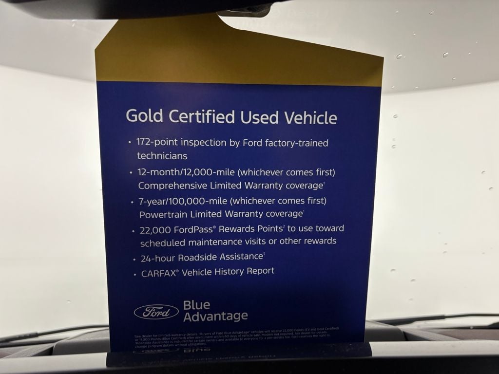 Ford Gold Certified includes:172 point vehicle inspection performed by a Ford Certified technician. 12-month/12,000-mile Comprehensive Limited Warranty coverage 7-year/100,000-mile Powertrain Limited Warranty coverage Gold Certification includes 22,000 FordPass Rewards Points Comprehensive Coverage: 12 months o
