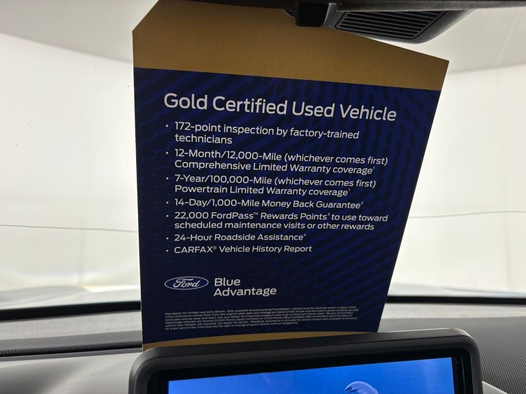 Ford Gold Certified includes:172 point vehicle inspection performed by a Ford Certified technician. 12-month/12,000-mile Comprehensive Limited Warranty coverage 7-year/100,000-mile Powertrain Limited Warranty coverage Gold Certification includes 22,000 FordPass Rewards Points Comprehensive Coverage: 12 months or 12,000 miles, whichever comes first, from the expiration of the new-vehicle bumperto-bumper limited warranty cover