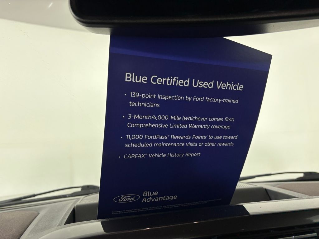 Ford Blue Certified includes:139 point vehicle inspection performed by an ASE Certified technician 3-month/4,000-mile Comprehensive Limited Warranty coverage that is fully competitive with other online retailers Blue Certification includes 11,000 FordPass Rewards Points For other manufacturers not listed above, Comprehensive Coverage is provided for 3 months or 4,000 miles, whichever comes first, from the signature date of the Ford Blue Advantage â" Blue Certified purchase. Compr