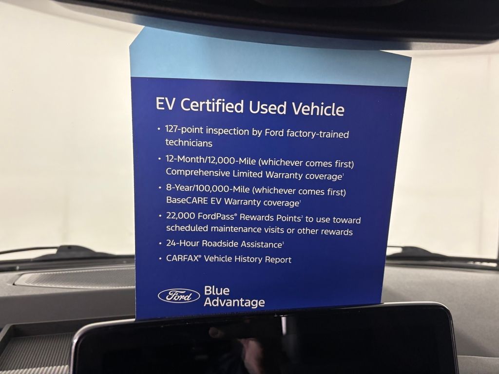 * Every EV Certified Vehicle Must be a Fully Electric Ford Model up to 6 years Old With No More Than 80,000 Miles on the Odometer. It Also Has to Pass an Extensive 127-Point Inspection. Plus, Each Comes With Manufacturer-Backed Comprehensive Limited Warranty Coverage, 8-Year/100,000-Mile (whichever comes first) Base CARE EV Limited Warranty coverage, a 14-Day/1,000-Mile (whichever comes first) Money Back Guarantee, complimentary 24/7, Ford Roadside Assistance and 22,000 FordPass Rewards Points to use toward your first two maintenance visits