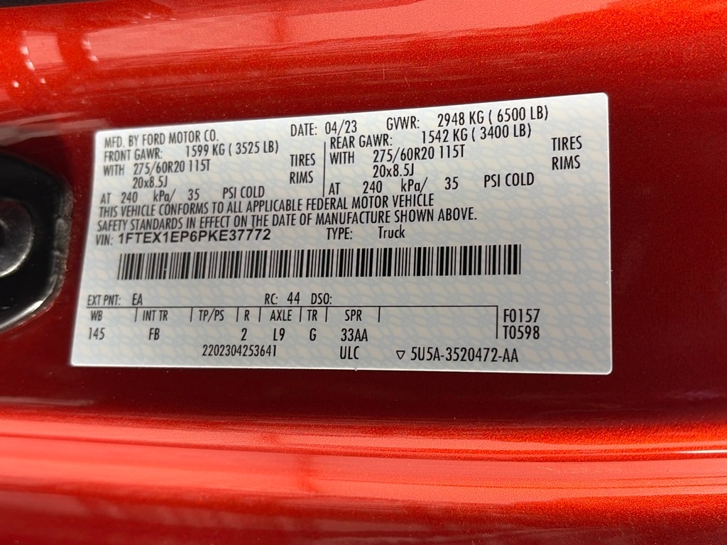 EQUIPMENT GROUP 302A HIGH Class IV Trailer Hitch Receiver, towing capability up to TBD lbs, on 3.3L V6 PFDI engine (99B) and 2.7L EcoBoost engine (99P) or up to TBD lbs, on 3.5L EcoBoost engine (998) and 5.0L V8 engine (995), 7/4-pin connector, class IV trailer hitch receiver, smart trailer tow connector ( BLIS w/trailer tow coverage where BLIS is available), XLT Chrome Appearance Package, lower grille trim, Chrome Single-Tip Exhaust, Tires: 275/65R18 BSW Automatic Transmission, Chrome Door & Tailgate Handles w/Body-Color Bezel, bezel on side doors and black on tailgate, Wheels: 18 Chrome-Like PVD, 2-Bar Style Grille w/Chrome 2 Minor Bars, silver painted surround and black background mesh, Bright Polished Step Bars, Zone Lighting, Intelligent Access w/Push Button Start, approach detection, SecuriCode, WHEELS: 20 6-SPOKE DARK ALLOY PAINTED ALUMINUM Tires: 275/60R20 BSW AT, ENGINE: 2.7L V6 ECOBOOST 3.55 Axle Ratio, GVWR: 6,500 lbs Payload Package, ELECTRONIC LOCKING W/3.55 AXLE RATIO, XLT SPORT APPEARANCE PACKAGE body-color wheellip moldings and unique interior finish, Box Side Decals, Chrome Single-Tip Exhaust, Body-Color Door & Tailgate Handles, body-color bezel on side doors and black on tailgate, Tires: 275/65R18 BSW Automatic Transmission, Wheels: 18 6-Spoke Machined Aluminum, gloss black painted pockets, Accent-Color Step Bars, Body-Color Front & Rear Bumpers, body-color front fascia, Black 2-Bar Style Grille w/Black Surround/Accents, TRANSMISSION: ELECTRONIC 10-SPEED AUTOMATIC selectable drive modes: normal, ECO, sport, tow/haul, slippery, deep snow/sand and mud/rut (STD). Ford XLT with Hot Pepper Red Tinted Clearcoat exterior and Black interior features a V6 Cylinder Engine with 290 HP at 6500 RPM*.