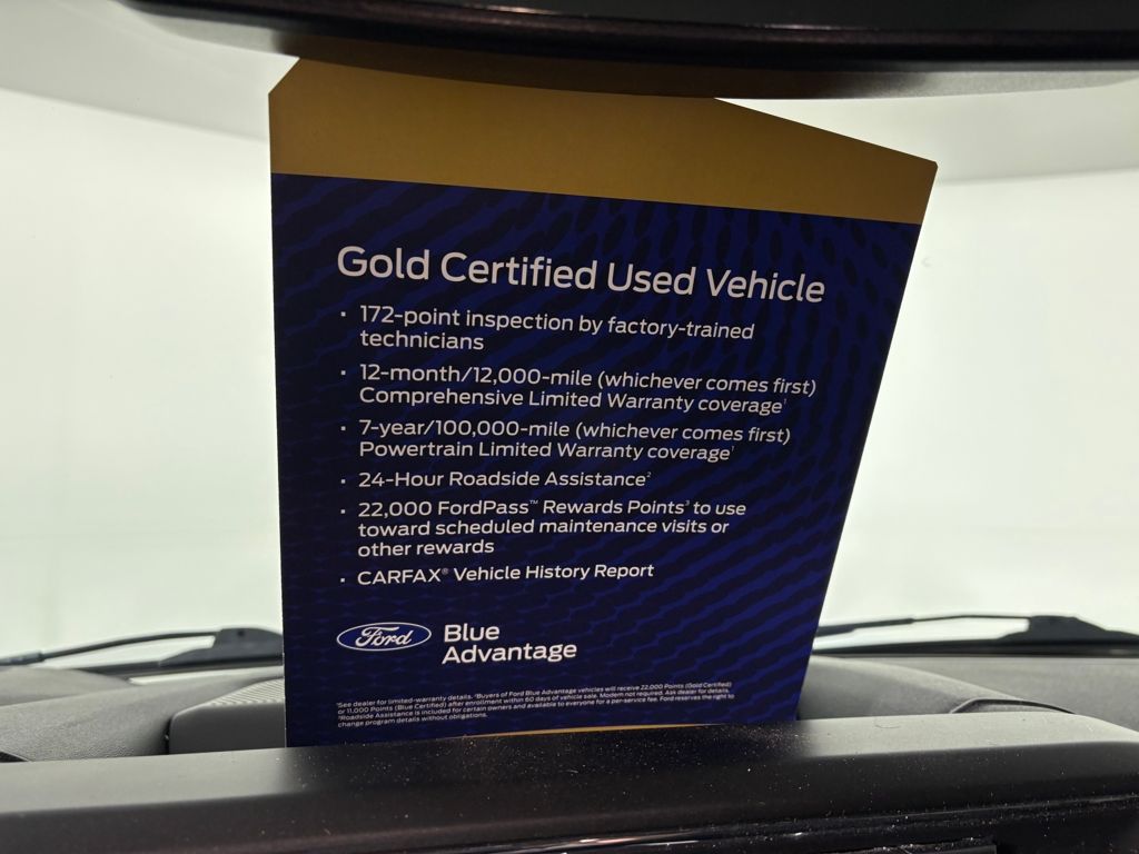 Ford Gold Certified includes:172 point vehicle inspection performed by a Ford Certified technician. 12-month/12,000-mile Comprehensive Limited Warranty coverage 7-year/100,000-mile Powertrain Limited Warranty coverage Gold Certification includes 22,000 FordPass Rewards Points Comprehensive Coverage: 12 months or 12,000 miles, whichever comes first, from the expiration of the new-vehicle bumperto-bumper