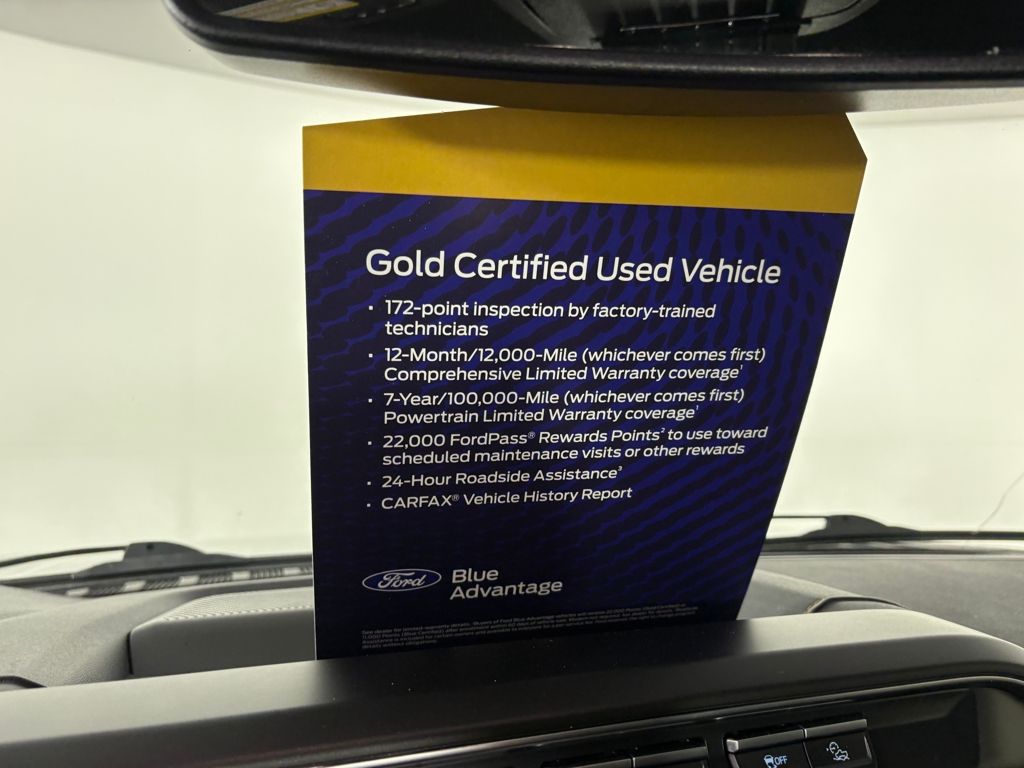 Ford Gold Certified includes:172 point vehicle inspection performed by a Ford Certified technician. 12-month/12,000-mile Comprehensive Limited Warranty coverage 7-year/100,000-mile Powertrain Limited Warranty coverage Gold Certification includes 22,000 FordPass Rewards Points Comprehensive Coverage: 12 months or 12,000 miles, whichever comes first, from the expiration of the new-vehicle bumperto