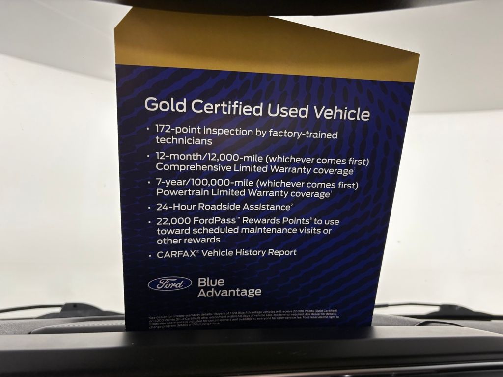 Ford Gold Certified includes:172 point vehicle inspection performed by a Ford Certified technician. 12-month/12,000-mile Comprehensive Limited Warranty coverage 7-year/100,000-mile Powertrain Limited Warranty coverage Gold Certification includes 22,000 FordPass Rewards Points Comprehensive Coverage: 12 months or 12,000 miles, whichever comes first, from the expiration of the new-vehicle bumperto-bumper lim