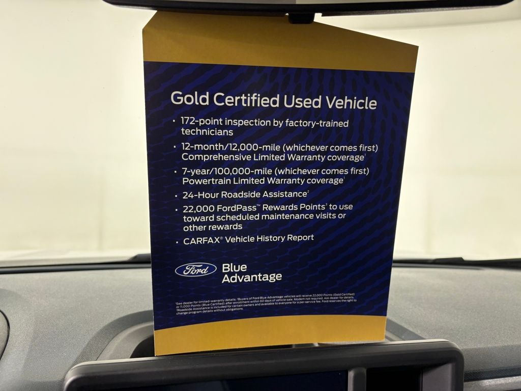Ford Gold Certified includes:172 point vehicle inspection performed by a Ford Certified technician. 12-month/12,000-mile Comprehensive Limited Warranty coverage 7-year/100,000-mile Powertrain Limited Warranty coverage Gold Certification includes 22,000 FordPass Rewards Points Comprehensive Coverage: 12 months or 12,000 miles, whichever comes first, from