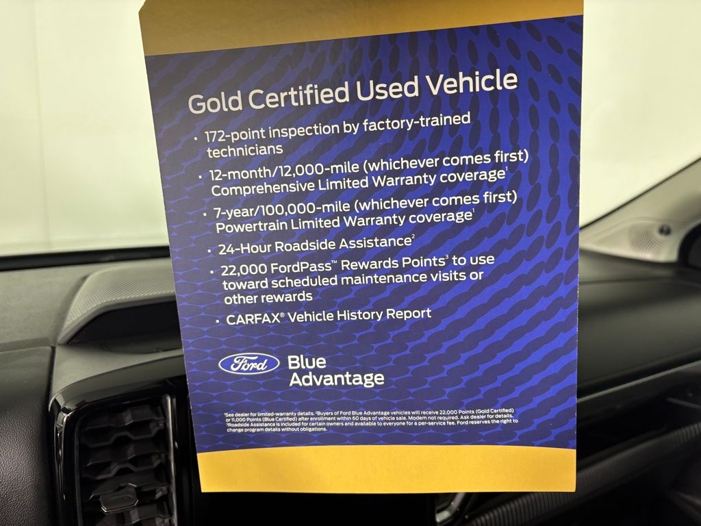Ford Gold Certified includes:172 point vehicle inspection performed by a Ford Certified technician. 12-month/12,000-mile Comprehensive Limited Warranty coverage 7-year/100,000-mile Powertrain Limited Warranty coverage Gold Certification includes 22,000 FordPass Rewards Points Comprehensive Coverage: 12 months or 12,000 miles, whichever comes first