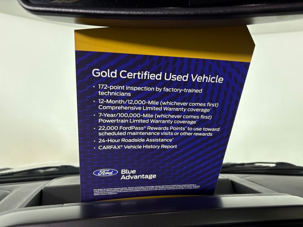 Ford Gold Certified includes:172 point vehicle inspection performed by a Ford Certified technician. 12-month/12,000-mile Comprehensive Limited Warranty coverage 7-year/100,000-mile Powertrain Limited Warranty coverage Gold Certification includes 22,000 FordPass Rewards Points Comprehensive Coverage: 12 months or 12,000 miles, whichever comes first, from the expira