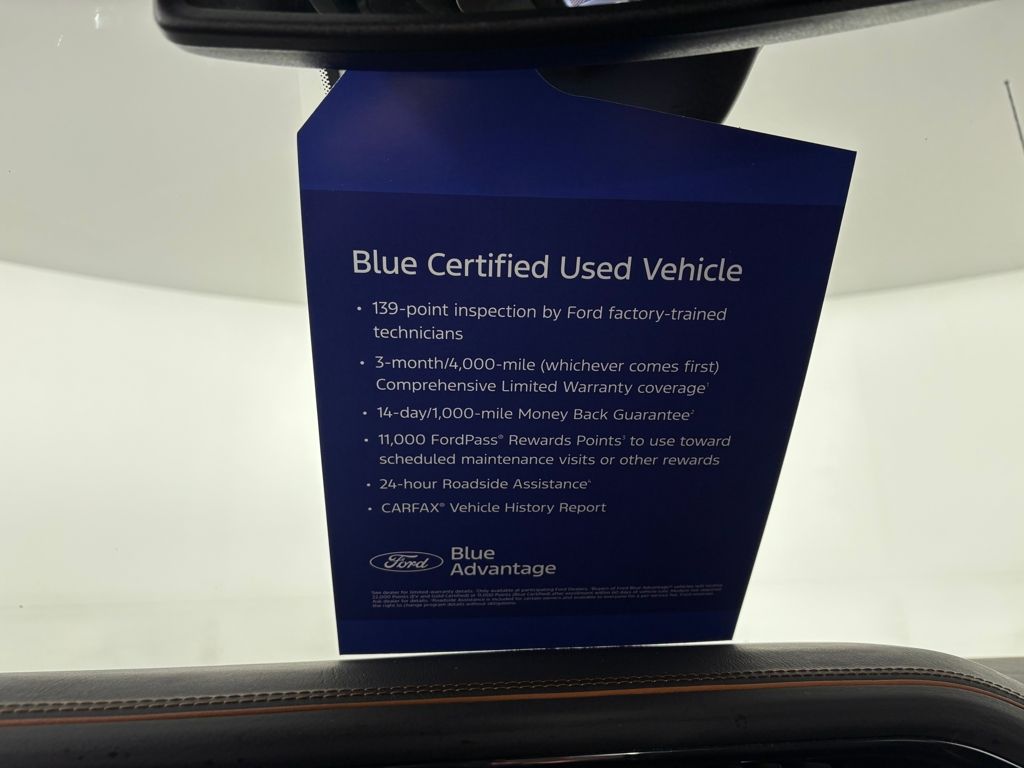 Ford Blue Certified includes:139 point vehicle inspection performed by an ASE Certified technician 3-month/4,000-mile Comprehensive Limited Warranty coverage that is fully competitive with other online retailers Blue Certification includes 11,000 FordPass Rewards Points For other manufacturers not listed above, Comprehensive Coverage is provided for 3 months or 4,000 miles, whichever comes first, from the signature date of the Ford Blue Advantage â" Blue Certified purchase. Comprehensive Limited Warranty covering 1,000+ components Travel expense reimbursement Re