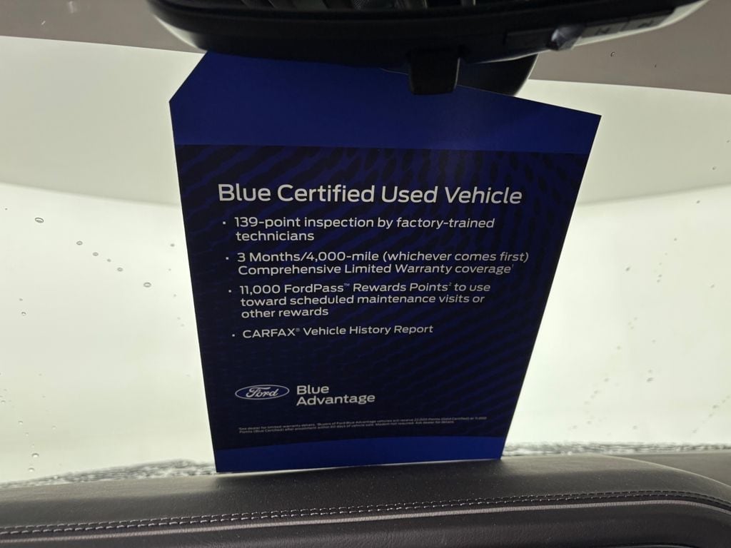 Ford Blue Certified includes:139 point vehicle inspection performed by an ASE Certified technician 3-month/4,000-mile Comprehensive Limited Warranty coverage that is fully competitive with other online retailers Blue Certification includes 11,000 FordPass Rewards Points For other manufacturers not listed above, Comprehensive Coverage is provided for 3 months or 4,000 miles, whichever comes first, from the signature date of the Ford Blue Advantage â" Blue Certified purchase. Comprehensive Limited Warranty covering 1,000+ components Travel expense reimbursement Rental car reimbursement SiriusXM 3 month trial.