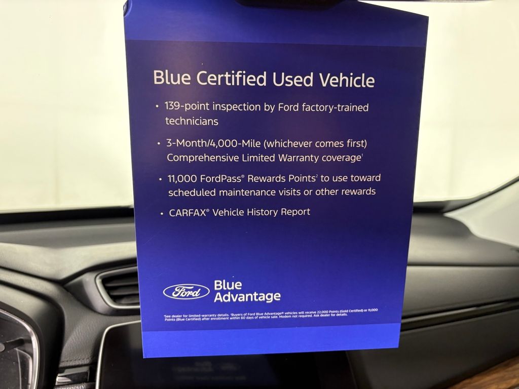Ford Blue Certified includes:139 point vehicle inspection performed by an ASE Certified technician 3-month/4,000-mile Comprehensive Limited Warranty coverage that is fully competitive with other online retailers Blue Certification includes 11,000 FordPass Rewards Points For other manufacturers not listed above, Comprehensive Coverage is provided f