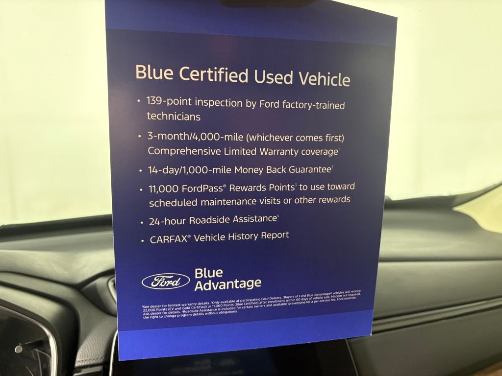 Ford Blue Certified includes:139 point vehicle inspection performed by an ASE Certified technician 3-month/4,000-mile Comprehensive Limited Warranty coverage that is fully competitive with other online retailers Blue Certification includes 11,000 FordPass Rewards Points For other manufacturers not listed above, Comprehensive Coverage is provided for 3 months or 4,000 miles, whichever comes first, from the signature date of the Ford Blue Advantage â" Blue Certified purch