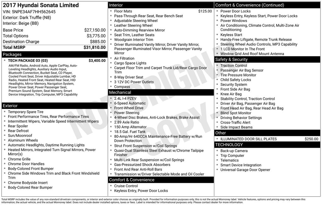 Tech Package 03, Hyundai Select Used Certified, Beige Leather, 4-Wheel Disc Brakes, 4.2-inch Color LCD Multi-Info Display, 6 Speakers, ABS brakes, Air Conditioning, Alloy wheels, AM/FM radio: SiriusXM, Apple CarPlay & Android Auto, Auto-dimming Rear-View mirror, Automatic temperature control, Brake assist, Bumpers: body-color, Carpeted Floor Mats, CD player, Compass, Delay-off headlights, Driver door bin, Driver vanity mirror, Dual front impact airbags, Dual front side impact airbags, Dynamic Bending Light (DBL), Electronic Stability Control, Emergency communication system: Blue Link, Exterior Parking Camera Rear, Four wheel independent suspension, Front anti-roll bar, Front Bucket Seats, Front Center Armrest, Front dual zone A/C, Front reading lights, Fully automatic headlights, Garage door transmitter: HomeLink, Heated door mirrors, Heated Front Bucket Seats, Heated front seats, Heated Rear Seats, Heated/Ventilated Front Bucket Seats, High-Intensity Discharge Xenon Headlights, Illuminated Door Sill Plates, Illuminated entry, Integrated Memory System (IMS), Knee airbag, Leather Seating Surfaces, Leather Shift Knob, Leather steering wheel, LED Interior Lights, Low tire pressure warning, Occupant sensing airbag, Outside temperature display, Overhead airbag, Overhead console, Panic alarm, Passenger door bin, Passenger vanity mirror, Power door mirrors, Power driver seat, Power moonroof, Power passenger seat, Power steering, Power windows, Radio: AM/FM/SiriusXM/CD/MP3 Display Audio, Radio: AM/FM/SiriusXM/CD/MP3 w/Navigation, Rear anti-roll bar, Rear seat center armrest, Rear Side Window Sunshades, Rear window defroster, Remote keyless entry, Security system, SiriusXM Travel Link (Complimentary Trial), Speed control, Speed-sensing steering, Speed-Sensitive Wipers, Split folding rear seat, Spoiler, Steering wheel mounted audio controls, Tachometer, Telescoping steering wheel, Tilt steering wheel, Traction control, Trip computer, Turn signal indicator mirrors, Variably intermittent wipers, and Wheels: 17 x 7.0J Aluminum Alloy.