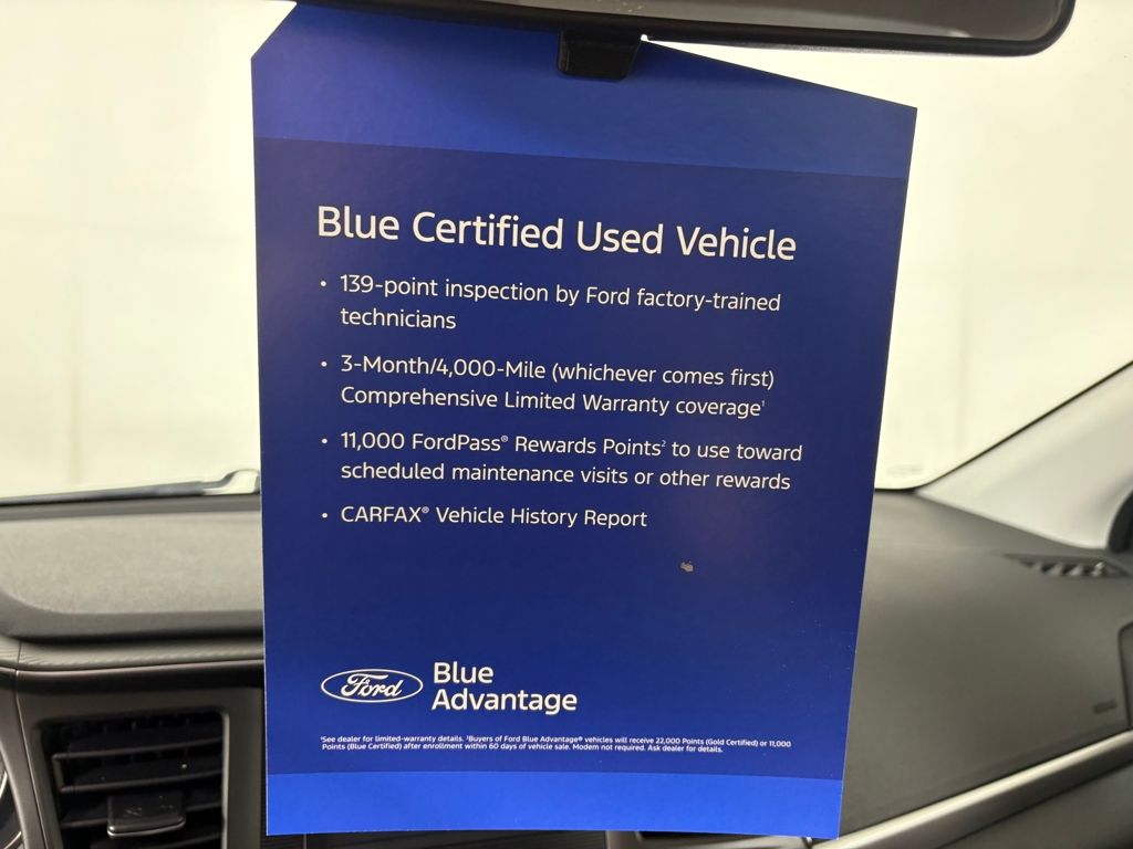 Ford Blue Certified includes:139 point vehicle inspection performed by an ASE Certified technician 3-month/4,000-mile Comprehensive Limited Warranty coverage that is fully competitive with other online retailers Blue Certification includes 11,000 FordPass Rewards Points For other manufacturers not listed above, Comprehensive Coverage is provided for 3 months or 4,000 miles, whichever comes first, from the signature date of the Ford Blue Advantage â"