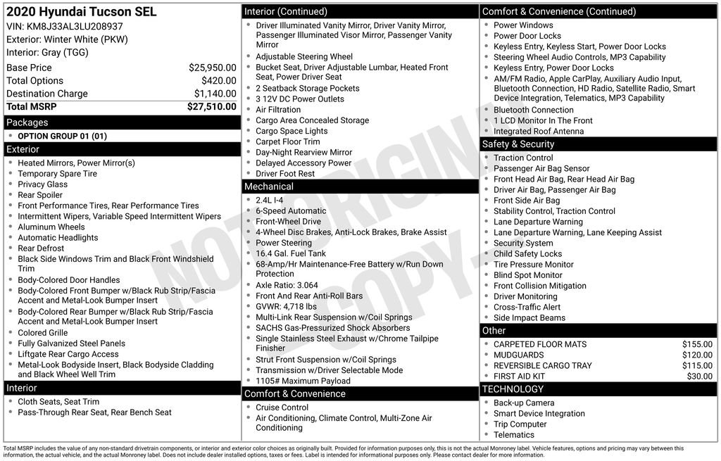 Option Group 01, Hyundai Certified Used Vehicles Certified, 18" x 7.0J Alloy Wheels, 4-Wheel Disc Brakes, 6 Speakers, ABS brakes, Air Conditioning, Alloy wheels, AM/FM radio: SiriusXM, Apple CarPlay & Android Auto, Automatic temperature control, Axle Ratio: 3.064, Brake assist, Bumpers: body-color, Carpeted Floor Mats, Delay-off headlights, Driver door bin, Driver vanity mirror, Dual front impact airbags, Dual front side impact airbags, Electronic Stability Control, Emergency communication system, Exterior Parking Camera Rear, First Aid Kit, Four wheel independent suspension, Front anti-roll bar, Front Bucket Seats, Front Center Armrest, Front dual zone A/C, Front reading lights, Fully automatic headlights, Heated door mirrors, Heated Front Bucket Seats, Heated front seats, Illuminated entry, Low tire pressure warning, Mudguards, Occupant sensing airbag, Outside temperature display, Overhead airbag, Overhead console, Panic alarm, Passenger door bin, Passenger vanity mirror, Power door mirrors, Power driver seat, Power steering, Power windows, Radio: AM/FM/SiriusXM Audio System, Rear anti-roll bar, Rear seat center armrest, Rear window defroster, Rear window wiper, Remote keyless entry, Reversible Cargo Tray, Roof rack: rails only, Security system, Speed control, Speed-sensing steering, Split folding rear seat, Spoiler, Steering wheel mounted audio controls, Tachometer, Telescoping steering wheel, Tilt steering wheel, Traction control, Trip computer, Variably intermittent wipers, and YES Essentials Stain-Resistant Cloth Seat Trim.