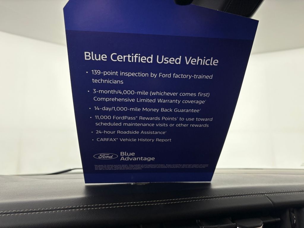Ford Blue Certified includes:139 point vehicle inspection performed by an ASE Certified technician 3-month/4,000-mile Comprehensive Limited Warranty coverage that is fully competitive with other online retailers Blue Certification includes 11,000 FordPass Rewards Points For other manufacturers not listed above, Comprehensive Coverage is provided for 3 months or 4,000 miles, whichever comes first, from the signature date of the Ford Blue Advantage â" Blue Certified purchase. Comprehensive Limited Warranty covering 1,000+ components Travel expense reimbursement Rental car reimbursement SiriusXM 3 mont