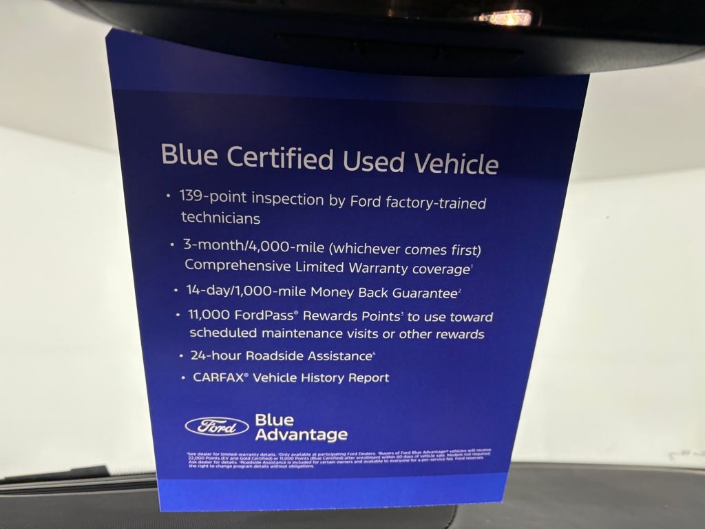 Ford Blue Certified includes:139 point vehicle inspection performed by an ASE Certified technician 3-month/4,000-mile Comprehensive Limited Warranty coverage that is fully competitive with other online retailers Blue Certification includes 11,000 FordPass Rewards Points For other manufacturers not listed above, Comprehensive Coverage is provided for 3 months or 4,000 miles, whichever comes first, from the signature date of the Ford Blue Advantage â" Blue Certified purchase. Comprehensive Limited Warranty covering 1,000+ components Travel expense reimbursement Rental car reimbursement SiriusXM 3