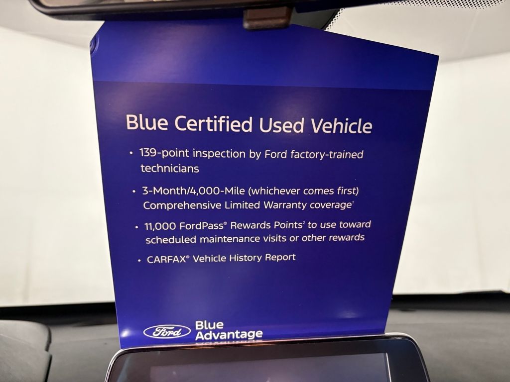 Ford Blue Certified includes:139 point vehicle inspection performed by an ASE Certified technician 3-month/4,000-mile Comprehensive Limited Warranty coverage that is fully competitive with other online retailers Blue Certification includes 11,000 FordPass Rewards Points For other manufacturers not listed above, Comprehensive Coverage is provided for 3 months or 4,000 miles, whichever comes first, from the signature date of the Ford Blue Advantage â" Blue Certified purchase. Comprehensive Limited Warr