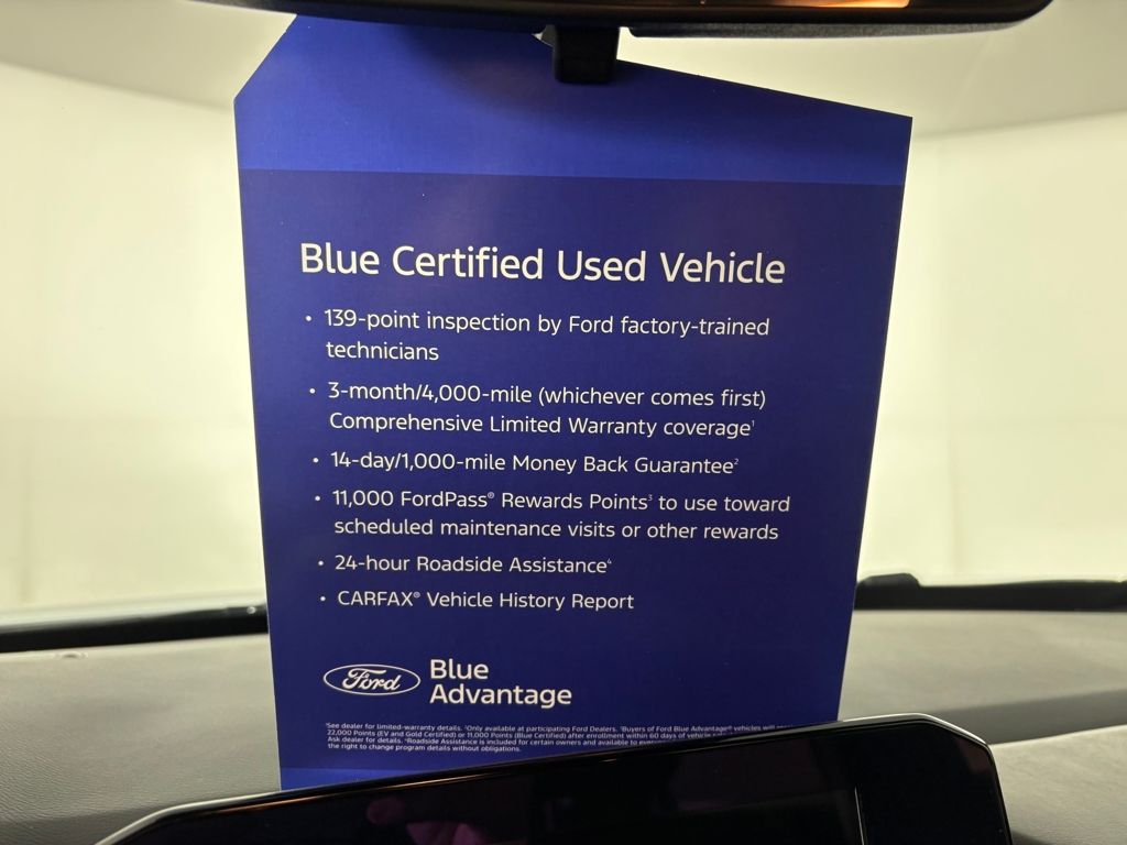 Ford Blue Certified includes:139 point vehicle inspection performed by an ASE Certified technician 3-month/4,000-mile Comprehensive Limited Warranty coverage that is fully competitive with other online retailers Blue Certification includes 11,000 FordPass Rewards Points For other manufacturers not listed above, Comprehensive Coverage is provided for 3 months or 4,000 miles, whichever comes first, from the signature date of the Ford Blue Advantage â" Blue Certified
