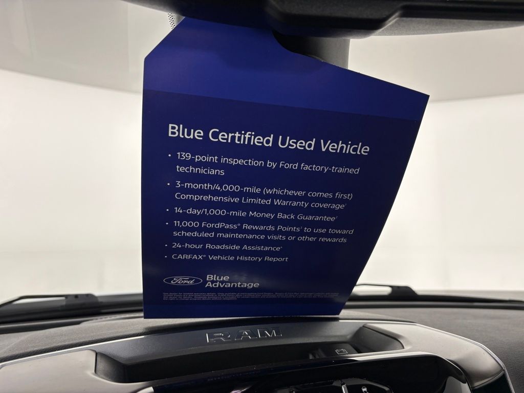 Ford Blue Certified includes:139 point vehicle inspection performed by an ASE Certified technician 3-month/4,000-mile Comprehensive Limited Warranty coverage that is fully competitive with other online retailers Blue Certification includes 11,000 FordPass Rewards Points For other manufacturers not listed above, Comprehensive Coverage is provided for 3 months or 4,000 miles, whichever comes first, from the signature date of the Ford Blue Advantage â" Blue Certified purchase. Comprehensive Limited Warranty covering 1,000+ components Travel expense reimbursement Rental car reimbursement SiriusXM 3 month trial.