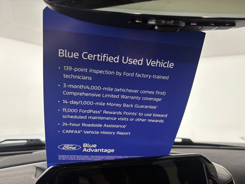 139 point vehicle inspection performed by an ASE Certified technician 3-month/4,000-mile Comprehensive Limited Warranty coverage that is fully competitive with other online retailers Blue Certification includes 11,000 FordPass Rewards Points For other manufacturers not listed above, Comprehensive Coverage is provided for 3 months or 4,000 miles, whichever comes first, from the signature date of the Ford Blue Advantage â" Blue Certified purchase. Comprehensive Limited Warranty covering 1,000+ components Travel expense reimbursement Rental car reimbursement SiriusXM 3 month tria. Recent Arrival!