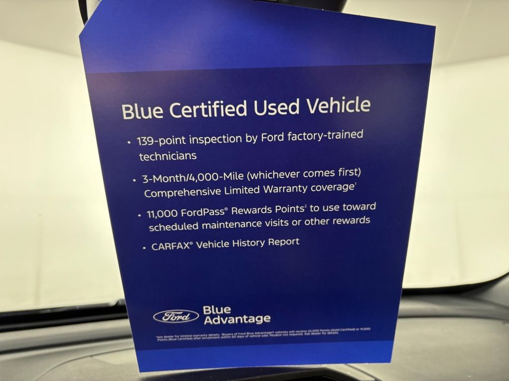 Ford Blue Certified includes:139 point vehicle inspection performed by an ASE Certified technician 3-month/4,000-mile Comprehensive Limited Warranty coverage that is fully competitive with other online retailers Blue Certification includes 11,000 FordPass Rewards Points For other manufacturers not listed above, Comprehensive Coverage is provided for 3 months or 4,000 miles, whichever comes first, from the signature date of the Ford Blue Advantage â" Blue Certified purchase. Comprehensive Limited Warranty covering 1,000+ components Travel expense reimbursement Rental car reimbursement SiriusXM 3 month trial.
