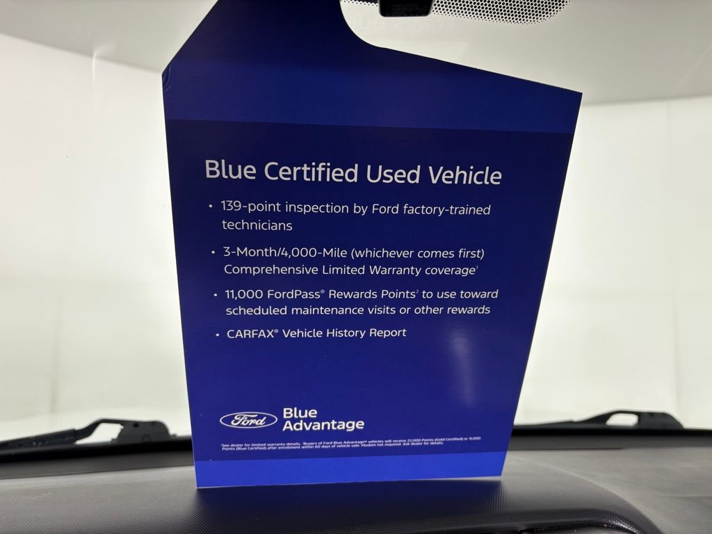 Ford Blue Certified includes:139 point vehicle inspection performed by an ASE Certified technician 3-month/4,000-mile Comprehensive Limited Warranty coverage that is fully competitive with other online retailers Blue Certification includes 11,000 FordPass Rewards Points For other manufacturers not listed above, Comprehensive Coverage is provided for 3 months or 4,000 miles, whichever comes first, from the signature date of the Ford Blue Advantage â" Blue Certified purchase. Comprehensive Limited Warranty covering 1,000+ components Travel expense reimbursement Rental car reimbursement SiriusXM 3 month trial.