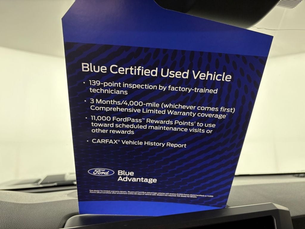 139 point vehicle inspection performed by an ASE Certified technician 3-month/4,000-mile Comprehensive Limited Warranty coverage that is fully competitive with other online retailers Blue Certification includes 11,000 FordPass Rewards Points For other manufacturers not listed above, Comprehensive Coverage is provided for 3 months or 4,000 miles, whichever comes first, from the signature date of the Ford Blue Advantage â" Blue Certified purchase. Comprehensive Limited Warranty covering 1,000+ components Travel expense reimbursement Rental car reimbursement SiriusXM 3 month tria. Recent Arrival! Odometer is 5439 miles below market average!