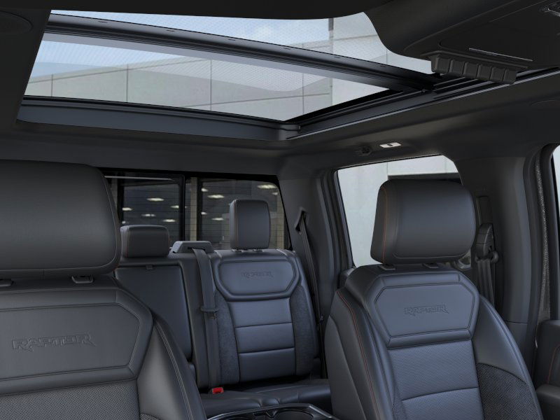 TWIN PANEL MOONROOF, TOUGH BED SPRAY-IN BEDLINER, TRANSMISSION: ELECTRONIC 10-SPEED AUTOMATIC SelectShift w/paddle shifters and terrain management modes: normal, sport, tow-haul, slippery, rock crawl, off-road and baja (STD). Ford Raptor with Carbonized Gray exterior and Black interior features a V6 Cylinder Engine with 450 HP at 5250 RPM*.
