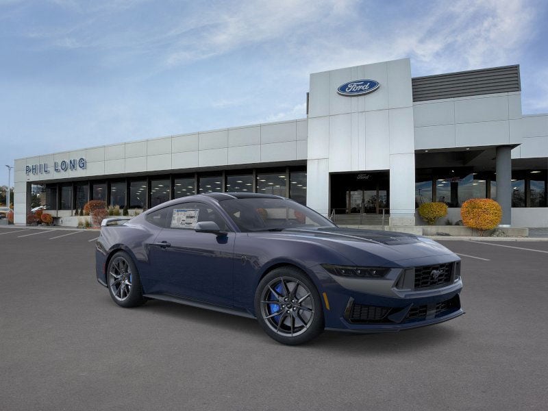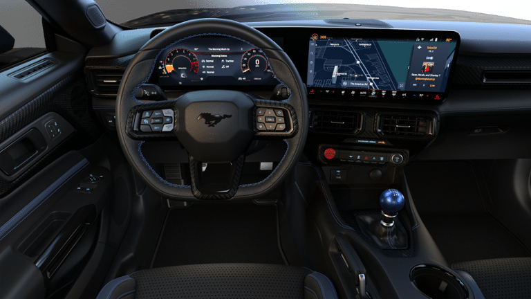 EQUIPMENT GROUP 700A DELUXE PACKAGE Premier Trim w/Color Accent Group, accent stitched center console lid and shifter boot and unique color-accented door-trim, Security Package, Active Anti-Theft System, Locking Center Console, Wheel Locking Kit, Approach Detection, welcome/farewell exterior lighting, Universal Garage Door Opener (UGDO), Driver Seat & Mirrors Memory, 3 settings, Aluminum Foot Pedals, PREMIUM FLOOR LINERS FRONT & REAR (W/CARPET MATS), TRANSMISSION: TREMEC 6-SPEED MANUAL rev matching (STD). Ford Dark Horse with Blue Ember exterior and Black/Blue interior features a 8 Cylinder Engine with 500 HP at 5000 RPM*.