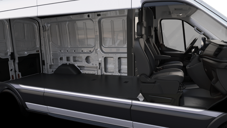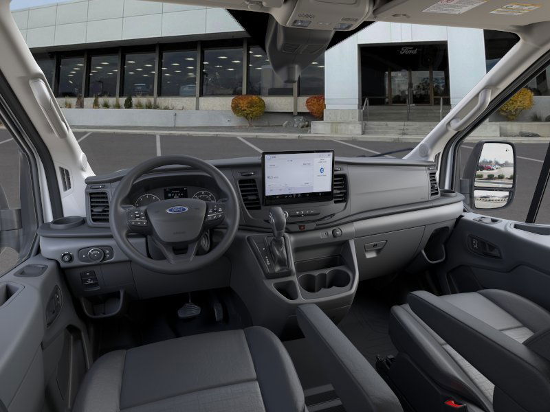 RADIO: AM/FM STEREO W/SYNC 4 12 multi-function display, Bluetooth®, dual USB ports, embedded voice recognition, connected navigation and 4 speakers (front), Electronic Air Temperature Control, LANE KEEPING SYSTEM Lane keeping system combines Blind Spot Information System (BLIS) w/lane keeping system to provide a visual warning and resistive steering torque to prevent a collision should an object be recognized in the vehicles blind spot while changing lanes, Short-Arm Pwr-Folding Heated Pwr Adjusting Mirrors, turn signals, SIDE SENSING SYSTEM Works similar to the reverse sensing system, as it sounds a tone when the vehicle gets close to surrounding vehicles and other objects, Front Sensing System, Front Fog Lamps, Auxiliary lamps that are generally integrated into the front fascia and designed to help illuminate the roadway during poor visibility, Reverse Sensing System, PASSENGER RUNNING BOARDS Covers the B-C pillar passenger-side, TRANSMISSION: 10-SPD AUTOMATIC W/OD & SELECTSHIFT auxiliary transmission oil cooler (STD). Ford Transit Cargo Van with Oxford White exterior and Dark Palazzo Gray interior features a V6 Cylinder Engine with 275 HP at 6250 RPM*.