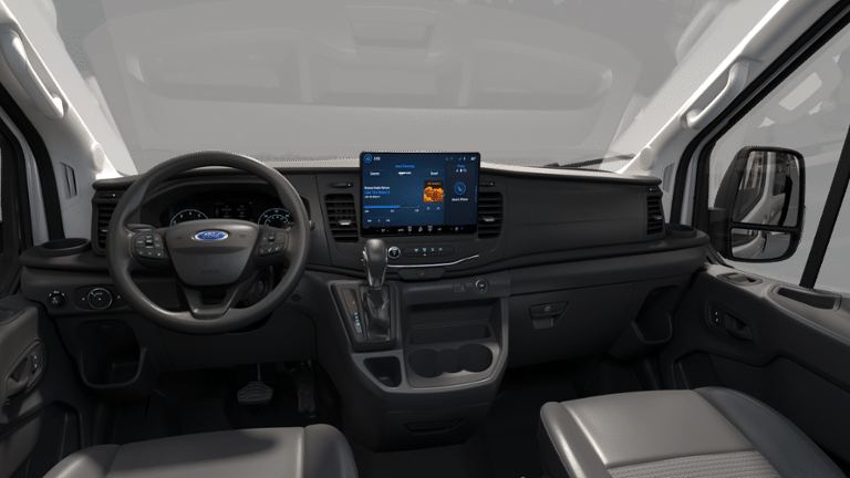 RADIO: AM/FM STEREO W/SYNC 4 12 multi-function display, Bluetooth®, dual USB ports, embedded voice recognition, connected navigation and 4 speakers (front), Electronic Air Temperature Control, LANE KEEPING SYSTEM Lane keeping system combines Blind Spot Information System (BLIS) w/lane keeping system to provide a visual warning and resistive steering torque to prevent a collision should an object be recognized in the vehicles blind spot while changing lanes, Short-Arm Pwr-Folding Heated Pwr Adjusting Mirrors, turn signals, SIDE SENSING SYSTEM Works similar to the reverse sensing system, as it sounds a tone when the vehicle gets close to surrounding vehicles and other objects, Front Sensing System, Front Fog Lamps, Auxiliary lamps that are generally integrated into the front fascia and designed to help illuminate the roadway during poor visibility, Reverse Sensing System, PASSENGER RUNNING BOARDS Covers the B-C pillar passenger-side, TRANSMISSION: 10-SPD AUTOMATIC W/OD & SELECTSHIFT auxiliary transmission oil cooler (STD). Ford Transit Cargo Van with Oxford White exterior and Dark Palazzo Gray interior features a V6 Cylinder Engine with 275 HP at 6250 RPM*.