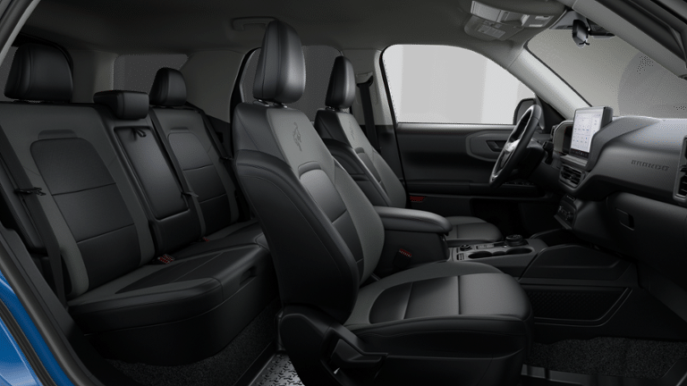 CONVENIENCE PACKAGE Flood Light Adjustable Liftgate, Front Driver/Passenger Seat Back Map Pockets, Premium Wrapped Steering Wheel, Heated 8-Way Power Drivers Seat, (Fore/aft, up/down, recline, lumbar), LED Fog Lamps, BLACK APPEARANCE PACKAGE textured matte black hood graphic and unique badges w/black accents, Painted Shadow Black Roof, Cargo Mat, Custom accessory, pre-installed, Wheels: 17 Matte Black-Painted Aluminum, Front & Rear Floor Liners w/o Carpet Mats, Custom accessory, pre-installed, Liftgate w/Black BRONCO SPORT Lettering, Carbon Black Grille w/Blk Painted BRONCO Lettering, ENGINE: 1.5L ECOBOOST auto start-stop technology (STD). Ford Big Bend with Velocity Blue exterior and Ebony interior features a 3 Cylinder Engine with 181 HP at 6000 RPM*.