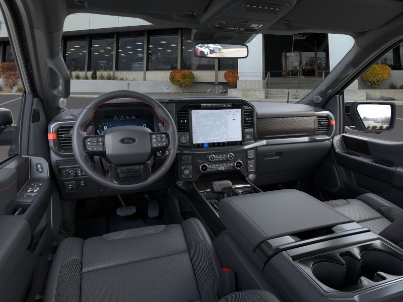 TRANSMISSION: ELECTRONIC 10-SPEED AUTOMATIC SelectShift w/paddle shifters and terrain management modes: normal, sport, tow-haul, slippery, rock crawl, off-road and baja (STD). Ford Raptor with Agate Black exterior and Black interior features a V6 Cylinder Engine with 450 HP at 5250 RPM*.