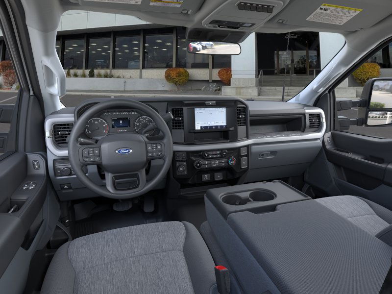 Ford Connectivity Package (1-Year Included), GVWR: 22,000 lbs Payload Package, Internet access capable: 5G Modem - Ford Connectivity Package, 4 Speakers, 4-Wheel Disc Brakes, ABS brakes, Air Conditioning, AM/FM radio, Brake assist, Center High-Mounted Stop Lamp (CHMSL), Cloth 40/20/40 Split Bench Seat, Compass, Delay-off headlights, Dual front impact airbags, Dual front side impact airbags, Dual rear wheels, Electronic Stability Control, Emergency communication system: SYNC 4 911 Assist, Engine Block Heater, Front anti-roll bar, Front Center Armrest w/Storage, Front License Plate Bracket, Front reading lights, Front Wheel Well Liner, Fully automatic headlights, Heated door mirrors, Illuminated entry, Low tire pressure warning, Outside temperature display, Overhead airbag, Overhead console, Panic alarm, Passenger cancellable airbag, Passenger vanity mirror, Power door mirrors, Power steering, Power windows, Pro Power Onboard - 2kW, Radio: AM/FM Stereo with MP3 Player, Rapid-Heat Supplemental Cab Heater, Rear anti-roll bar, Rear View Camera and Prep Kit, Remote keyless entry, Security system, Speed control, Steering wheel mounted audio controls, SYNC 4, Tachometer, Telescoping steering wheel, Tilt steering wheel, Traction control, Trip computer, Turn signal indicator mirrors, Variably intermittent wipers, and Wheels: 19.5" x 6.75" Argent Painted Steel.