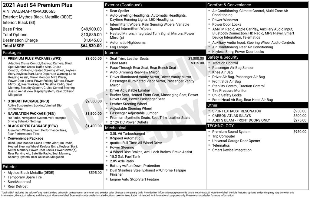 Black Optic Package (Body Color Side Sill Blades, High-Gloss Black Exterior Mirror Housings, High-gloss Black Exterior Trim, and Wheels: 19" 5-V-Spoke-Star Design), Convenience Package (Alarm System w/Motion Sensors, Audi Advanced Key, Audi Side Assist w/Pre Sense Rear, Auto-Dimming Exterior Mirrors, Driver's Seat Memory, Heated Steering Wheel, Parking System Plus (Front/Rear Acoustic Sensors), and SiriusXM All Access Service), Navigation Package (Audi Connect PRIME & PLUS Online Services and MMI Navigation Plus), Premium Plus Package (2 Rear USB Charging Ports, Adaptive Cruise Control w/Traffic Jam Assist, Audi Active Lane Assist, Audi Phone Box, Audi Virtual Cockpit Plus, Hands-On Detection Steering Wheel, Leatherette Covered Center Console & Door Armrests, Power Folding Exterior Mirrors, and Top View Camera System), S Sport Package (Red Brake Calipers, Sport Adaptive Damping Suspension, and Sports Rear Differential), 10 Speakers, 4-Wheel Disc Brakes, ABS brakes, Air Conditioning, All-Weather Floor Mats, Alloy wheels, AM/FM radio, Audi S Beam - Front Doors Only, Audi smartphone interface (Apple CarPlay/Android Auto), Auto High-beam Headlights, Auto-dimming Rear-View mirror, Automatic temperature control, Bang & Olufsen Sound System w/3D Sound, Brake assist, Bumpers: body-color, Carbon Atlas Inlays, Cargo Mat, Compass, Delay-off headlights, Driver door bin, Driver vanity mirror, Dual front impact airbags, Dual front side impact airbags, Electronic Stability Control, Emergency communication system: Audi connect CARE, Exterior Parking Camera Rear, Four wheel independent suspension, Front anti-roll bar, Front Bucket Seats, Front Center Armrest, Front dual zone A/C, Front fog lights, Front reading lights, Garage door transmitter: HomeLink, Heated door mirrors, Heated Front S Sport Seats, Heated front seats, Illuminated entry, Knee airbag, Leather Shift Knob, Leather steering wheel, Leather/Alcantara Seats, Low tire pressure warning, Occupant sensing airbag, Outside temperature display, Overhead airbag, Overhead console, Panic alarm, Passenger door bin, Passenger vanity mirror, Power door mirrors, Power driver seat, Power moonroof, Power passenger seat, Power steering, Power windows, Radio data system, Radio: MMI w/Audi Sound System, Rain sensing wipers, Rear air conditioning, Rear anti-roll bar, Rear reading lights, Rear seat center armrest, Rear window defroster, Remote keyless entry, Speed control, Speed-sensing steering, Speed-Sensitive Wipers, Split folding rear seat, Spoiler, Sport Exhaust Resonator, Sport steering wheel, Steering wheel mounted audio controls, Tachometer, Telescoping steering wheel, Tilt steering wheel, Traction control, Trip computer, Turn signal indicator mirrors, Variably intermittent wipers, and Wheels: 18" 5-Y-Spoke Design.