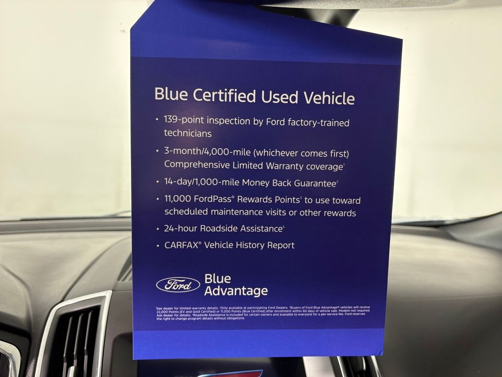 Ford Blue Certified includes:139 point vehicle inspection performed by an ASE Certified technician 3-month/4,000-mile Comprehensive Limited Warranty coverage that is fully competitive with other online retailers Blue Certification includes 11,000 FordPass Rewards Points For other manufacturers not listed above, Comprehensive Coverage is provided for 3 months or 4,000 miles, whichever comes first, from the signature date of the Ford Blue Advantage â" Blue Certified purchase. Comprehensive Limited Warranty covering 1