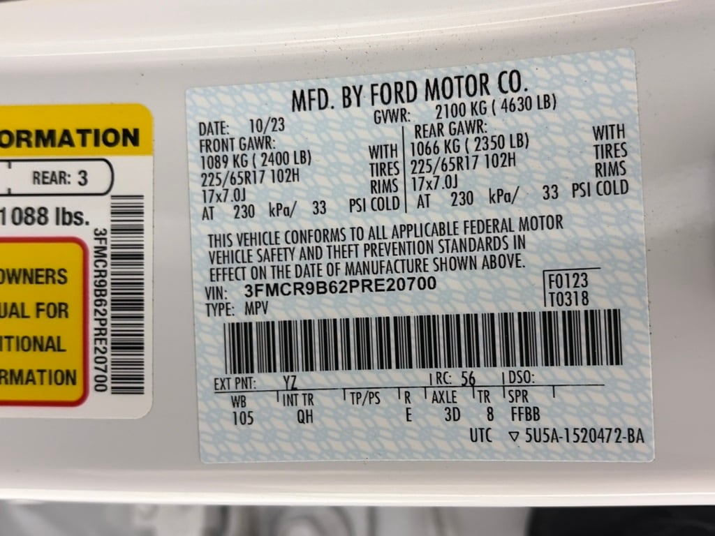 CONVENIENCE PACKAGE Front Driver & Passenger Seatback Zipper Pockets, Leather-Wrapped Steering Wheel, Rear Parking Sensors, Wireless Charging Pad, Heated Front Bucket Seats, 8-way power drivers seat (fore/aft, up/down, recline, lumbar), LED Fog Lamps, Universal Garage Door Opener (UGDO), Intelligent Access (Lock/Unlock), push-button start and SecuriCode keyless-entry keypad, POWER MOONROOF, FORD CO-PILOT360 ASSIST+ Evasive Steering Assist, Voice-Activated Touchscreen Navigation System, pinch-to-zoom capability and SiriusXM Traffic and Travel Link w/a, SiriusXM Traffic and Travel Links services are not available in Alaska and Hawaii, After your trial period ends, SiriusXM audio and data services each require a subscription sold separately, or as a package, by SiriusXM Radio Inc, See SiriusXM customer agreement for complete terms at www.siriusxm.com, All fees and programming subject to change, Trial subscription available in Alaska and Hawaii, Intelligent Adaptive Cruise Control w/Stop & Go, lane centering and speed sign recognition, ENGINE: 1.5L ECOBOOST auto start-stop technology (STD). Ford Big Bend with Oxford White exterior and Ebony interior features a 3 Cylinder Engine with 181 HP at 6000 RPM*.